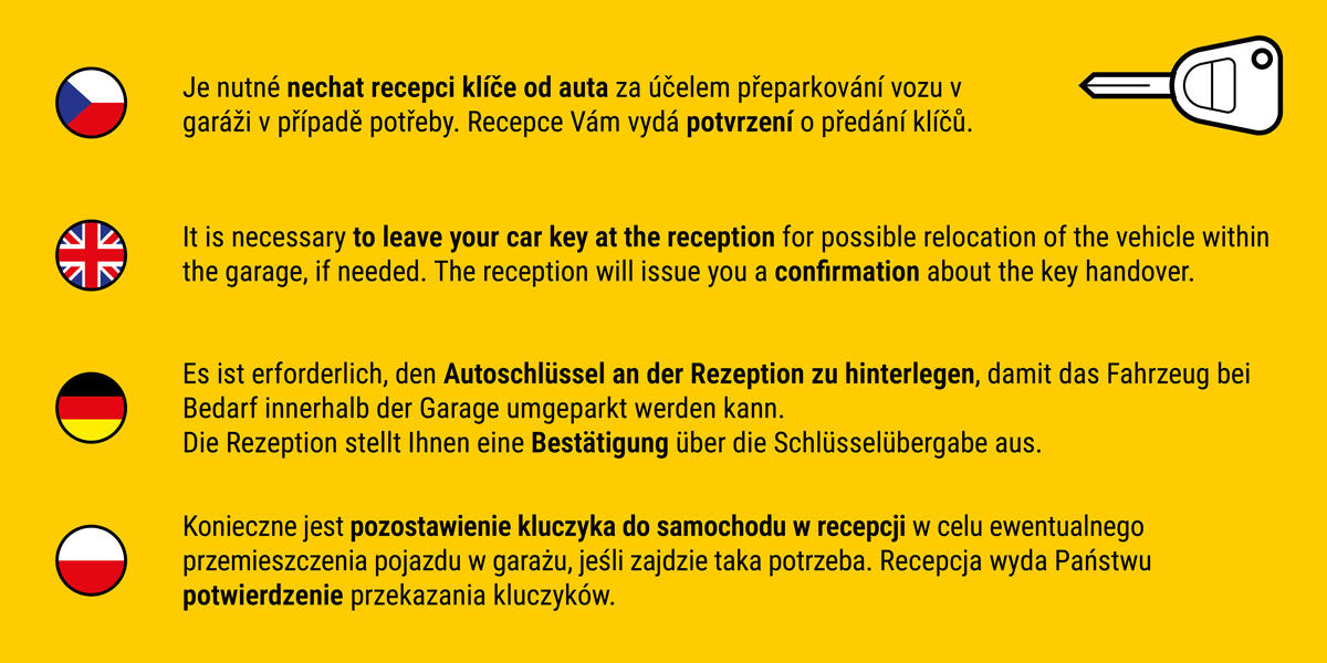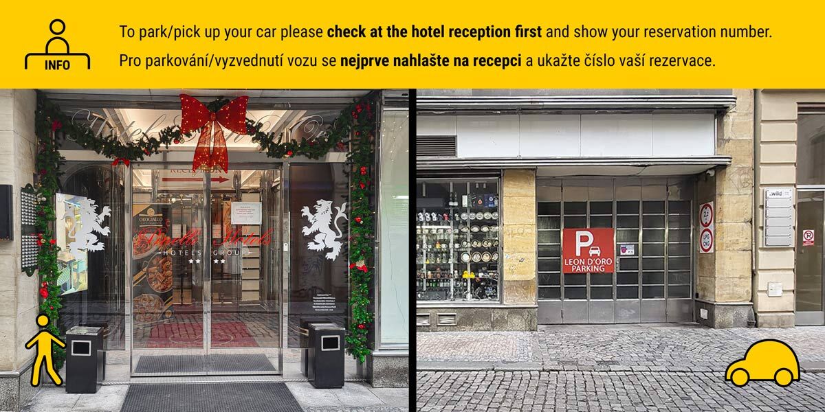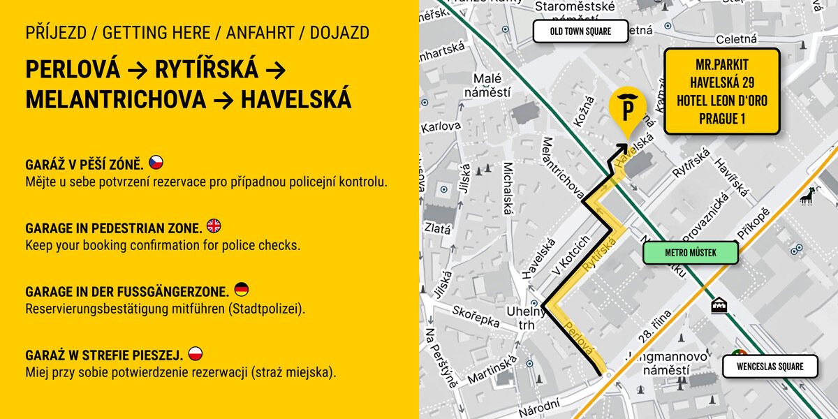 Für die Zufahrt zur Garage biegen Sie in die Straße Perlová ein und fahren anschließend über die Straßen Rytířská, Melantrichova und schließlich Havelská.Die Garage befindet sich in einer Fußgängerzone, bitte halten Sie daher Ihre Reservierungsbestätigung bereit, da diese von der Stadtpolizei verlangt werden kann.Nach Abschluss der Reservierung erhalten Sie eine Bestätigung per SMS, E-Mail und in der App. Halten Sie bei Ihrer Ankunft in der Nähe der Einfahrt, gehen Sie zu Fuß zur Rezeption des Hotels Leon und zeigen Sie Ihre Reservierungsnummer vor. Die Hotelmitarbeiter lassen Sie dann in die Garage. Aus Sicherheitsgründen müssen Sie Ihre Autoschlüssel an der Rezeption abgeben. Die Rezeption händigt Ihnen eine Bestätigung über die Schlüsselübergabe aus.