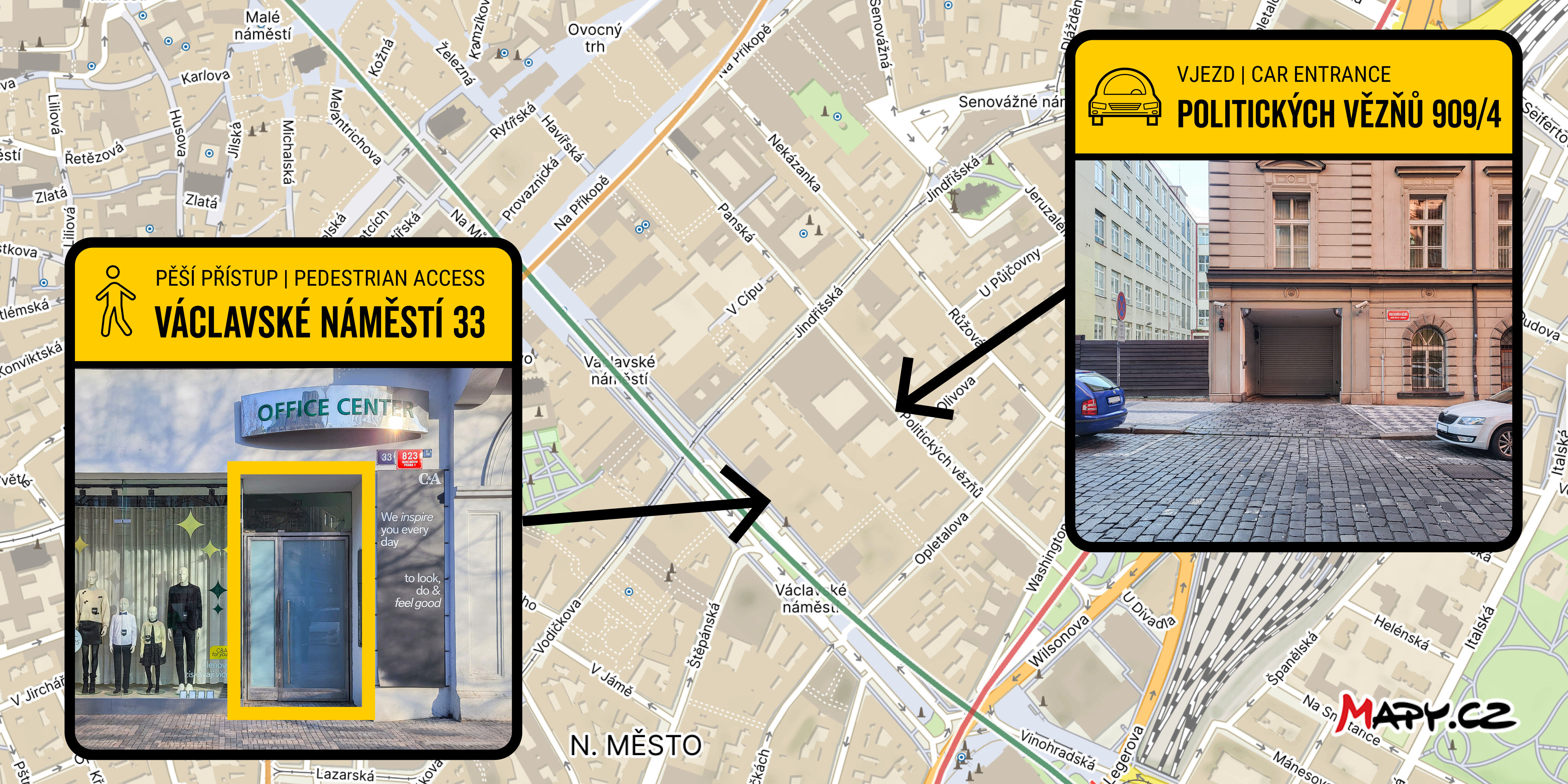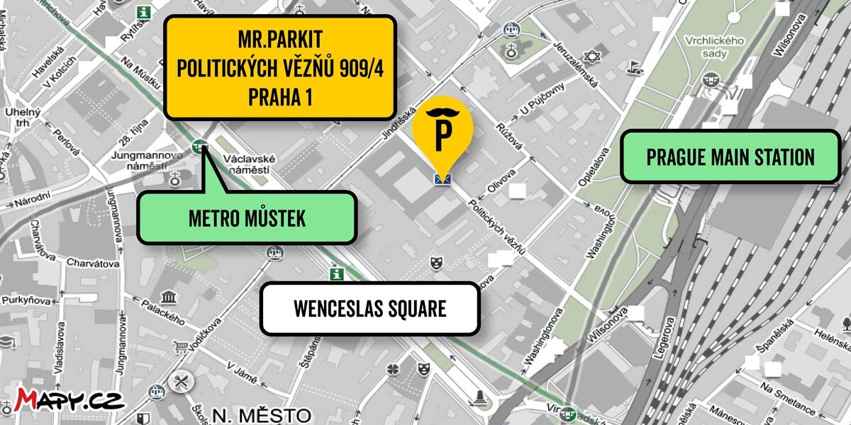 Parkuj bezpośrednio na Placu Wacława w prywatnym garażu z wejściem od ulicy Politických vězňů 909/4. Garaż jest położony w samym centrum miasta, w odległości spacerowej od historycznego centrum miasta.